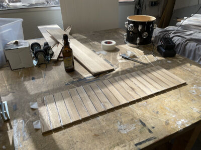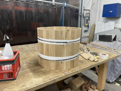 Beim Rundfräsen verlieren die Stäbe weitere Millimeter Stärke. Je dünner der Kessel, desto stärker die Resonanz. Die Pappelkessel waren 7mm stark, meine Eichenkessel ca. 10mm – aus Vorsicht. Je dünner die Kessel, desto leichter brechen sie beim Bearbeiten auseinander.