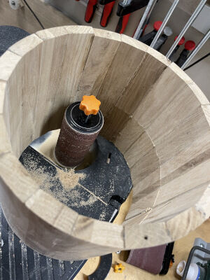 Als nächstes werden die Ränder auf die gleiche Höhe und nach oben verjüngend geschliffen, damit das Schlagzeugfell nicht auf der 10mm dicken Holzkante sitzt, sondern auf einem dünnen abgerundeten Rand. Sonst kommt das Fell nicht richtig ins Schwingen.