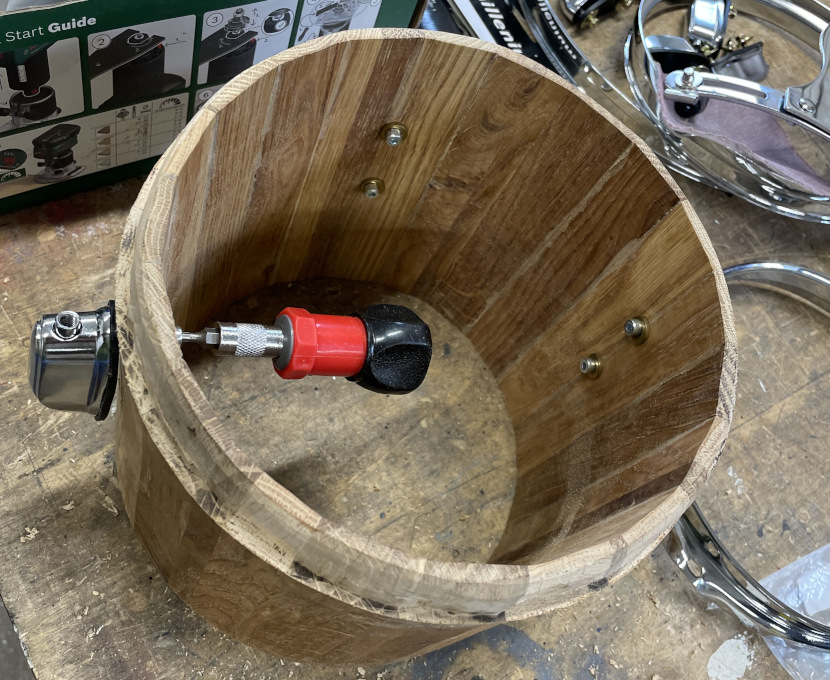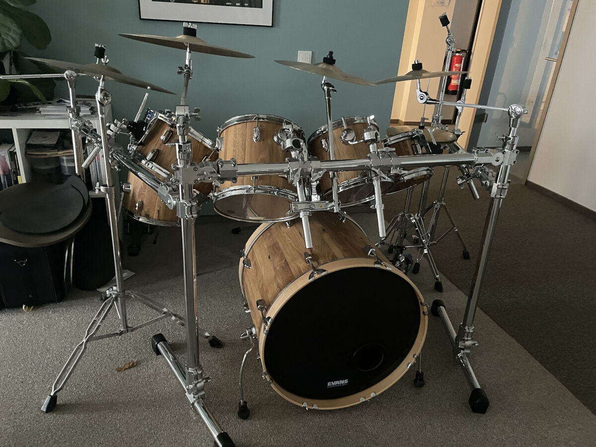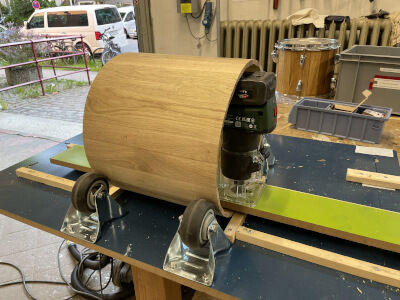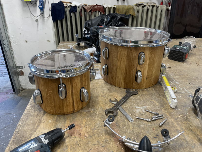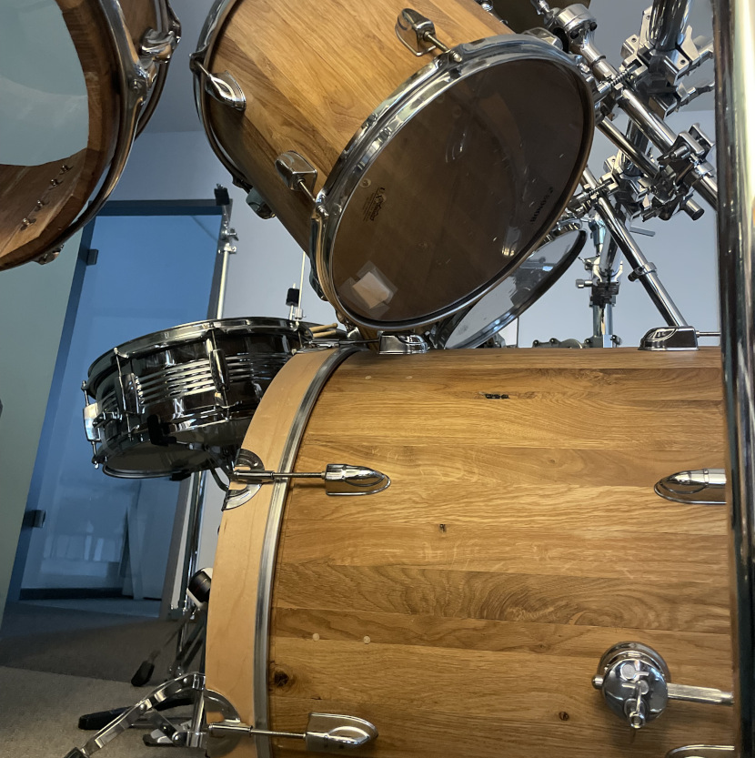 Da Boris Ritscher sich in seiner Firma Midmill Drums alle „Rigs“, also die Gestelle zum Fräsen selbst gebaut hat, ist mein Plan, es ähnlich zu machen und alle schwarzen Kessel bis auf die Snare Drum durch Wildeiche-Massivholz in Faßbauweise zu ersetzen.