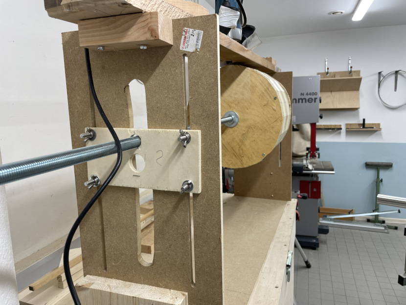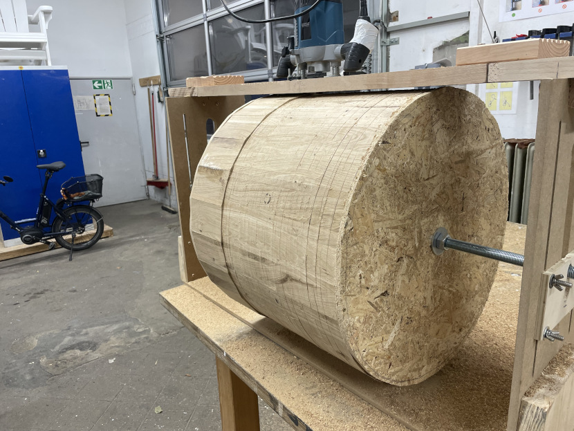 Dieses in der Werkstatt selbst gebaute Gestell aus Resten des Holzlagers lässt sich auf die verschiedenen Durchmesser der Kessel einstellen. Oben ist eine Fräse festgeschraubt, deren Fräskopf (ein Abnehmer von 20mm Durchmesser) durch ein Loch im Brett in der Höhe verstellt werden kann.
