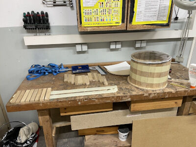 Wie weiß man, welche Schräge die Holzstäbe haben müssen, damit sie zusammengeleimt einen runden Kessel ergeben? Der erste Kessel, der als Fuß für einen Couchtisch endete, entsteht noch mit Mathe, Zollstock und reichlich Nacharbeiten.
