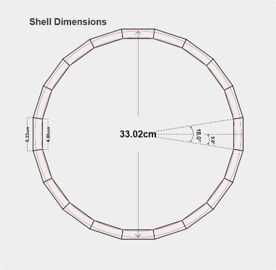 Mit dem Programm kannst Du festlegen, wie groß der Durchmesser des „Shell“ (also der Kessel von z.B. 13 Zoll - 33,02 cm), wie dick die „Staves“ (Stäbe) sein soll (1,5cm) und aus wie vielen Stäben (20) der Kessel besteht. Automatisch rechnet es den Winkel und die Maße der Stäbe aus.