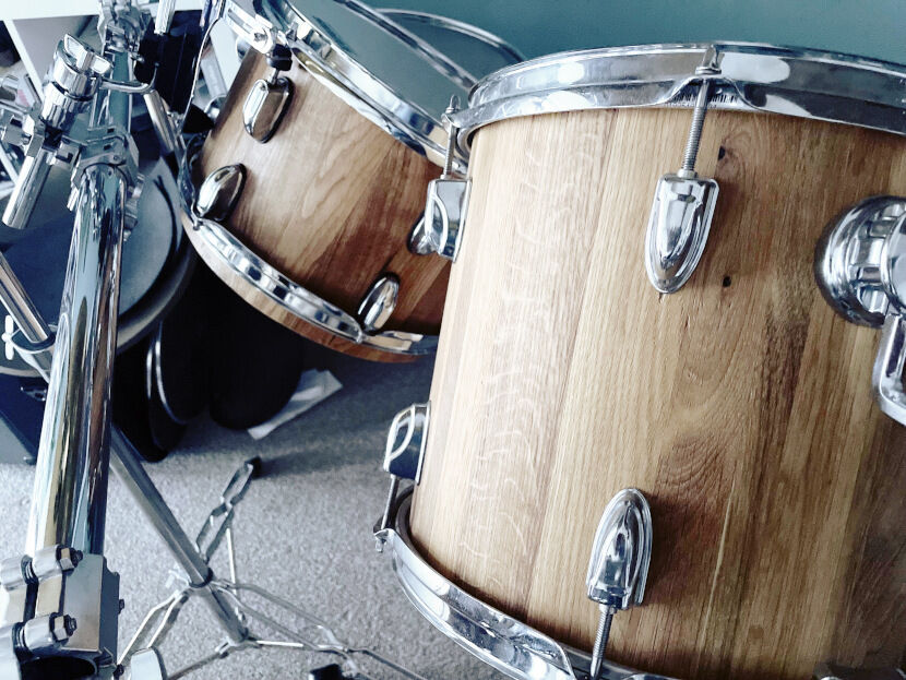 Die Bohlen des Weinfasses werden auseinandergesägt, geschliffen, angeschrägt, zu einem geraden Kessel verleimt und außen wie innen rundgefräst. Seine Schlagzeuge riechen tatsächlich nach Wein, heißt es.